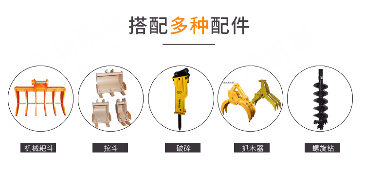 4、作業(yè)范圍廣,使用快速更換接頭,可選配旋挖鉆、破碎錘、裝載斗、抓具等各種屬具。