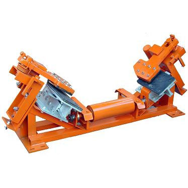 DDZ-30/80、100、1200、1400型帶式輸送機用斷帶抓捕器沿帶式輸送機多處安裝,當皮帶正常運行時,中部的單向輥輪隨皮帶轉動,左右兩楔形閘塊處于皮帶下方且與皮帶不接觸,上閘塊調整到皮帶兩側,且與皮帶縱向平行。當發(fā)生斷帶時,觸動裝置使上閘塊快速轉動到皮帶上方,同時帶動楔形閘塊繼續(xù)沿楔形槽運動,將下滑的皮帶夾持制動在上閘塊與楔形閘塊之間,阻止斷帶下滑。